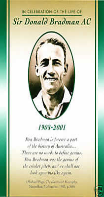 Bradman Commemorative Card, 2001This Postcard was put out by Australia Post, when Sir Don Bradman Died, in conjunction with a postage stamp honoring his life. It is double sided, on the front are these words.