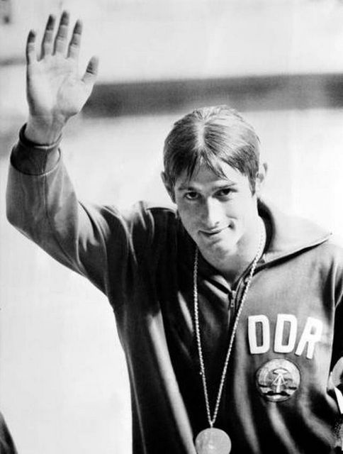 Images > aquatics > East Germany's Roland Matthes acknowledges the cheers of the crowd after receiving his gold medal for the men's 100m backstroke. Matthes won Double Gold Medals in the Backstroke. Roland Matthes was undefeated in backstroke events from 1967 to 1974, including the 1968 and 1972 Olympic Games. Public Domain image.
