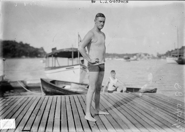 Images > aquatics > Leo Joseph "Budd" Goodwin (1883-1957), freestyle swimmer, diver, and water polo player who was a medalist in the 1908 Summer Olympics. The photo may have been taken later than 1908. The image is drawn from the US Library of Congress's collections. Believed to be in the public domain - LOC lists no known restrictions on publication.