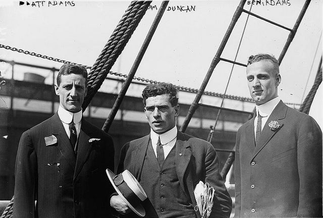 Images > athletics > Photo shows Platt Adams (1885-1961) with his brother Ben (b. 1890) and Jim Duncan (b. 1887) who were all American track and field athletes who competed in the 1912 Olympic games in Stockholm, Sweden. . The image is drawn from the US Library of Congress's collections. Believed to be in the public domain - LOC lists no known restrictions on publication.