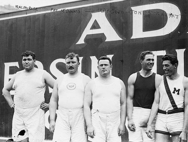 Images > athletics > members of the American track and field team at the 1912 Summer Olympics in Stockholm including Ralph Waldo Rose (1884-1913), Patrick Joseph McDonald (McDonnell) (1887-1954), Matthew John McGrath (1877-1941), John Paul Jones (1890-1970), and Albert Richard "Abel" Kiviat (1892-1991). The image is drawn from the US Library of Congress's collections. Believed to be in the public domain - LOC lists no known restrictions on publication.