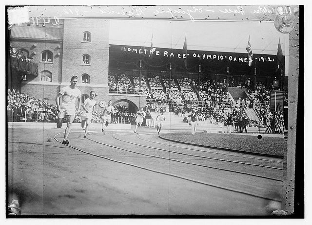 Images > athletics > Olympic Games 110m sprint race in Stockholm 1912. The image is marked to indicate it is the 110m race, but there was no such event. There is a 110m hurdle race, but there are no hurdles in this photo. It may be the 100m event, which is about 110 yards. It actually looks more like a 200m race.From the collection of the US LIbrary of Congress. Believed to be in the public domain - LOC lists no known restrictions on publication.