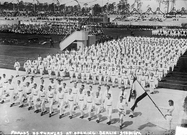 Images > ceremonies > opening ceremonies on June 8, 1913, for a sports stadium built in Berlin, Germany for the 1916 Summer Olympics which were canceled because of World War I. . The image is drawn from the US Library of Congress's collections. Believed to be in the public domain - LOC lists no known restrictions on publication.