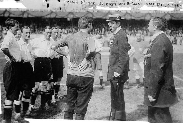 Images > football > Image of Crown Prince Gustav VI Adolf of Sweden (1882-1973) talking with soccer players in the stadium at the 1912 Olympic Games in Stockholm. The image is drawn from the US Library of Congress's collections. Believed to be in the public domain - LOC lists no known restrictions on publication.