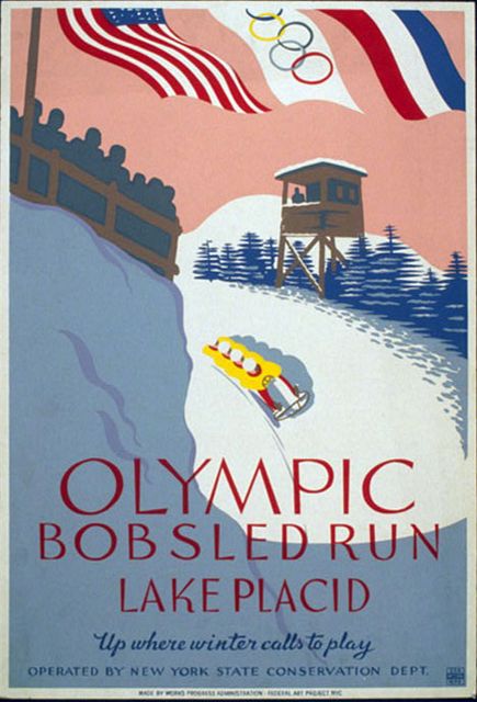 Olympic bobsled run poster from Lake Placid - Up where winter calls to play. The image is drawn from the US Library of Congress's collections. Believed to be in the public domain - LOC lists no known restrictions on publication.
