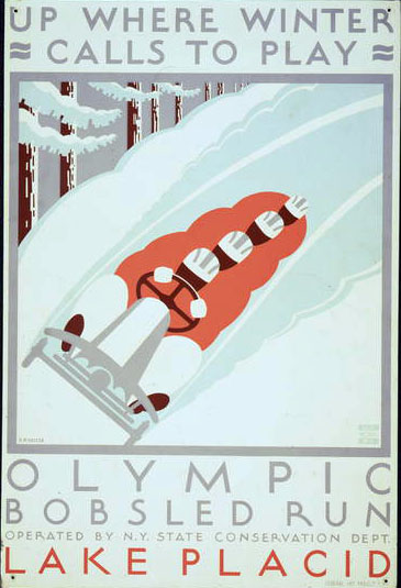 Up where winter calls to play Olympic bobsled run at Lake Placid. Poster promoting winter sports, showing four people in bobsled. The image is drawn from the US Library of Congress's collections. Believed to be in the public domain - LOC lists no known restrictions on publication.