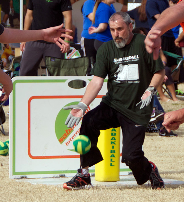 Sabakiball is a new sport created in 2009 by Michael Cerpok, originally from Arizona, USA. Sabakiball is currently being played in every state of the United States and across Canada. There are also Sabakiball games being played in Australia, China, India. It is a five-on-five team sport where one team tries to strike the opposing teams goal pin causing it to fall down or move off of the goal-pin spot. The sport was awarded a patent on the equipment as well as on the rules of play in 2011.